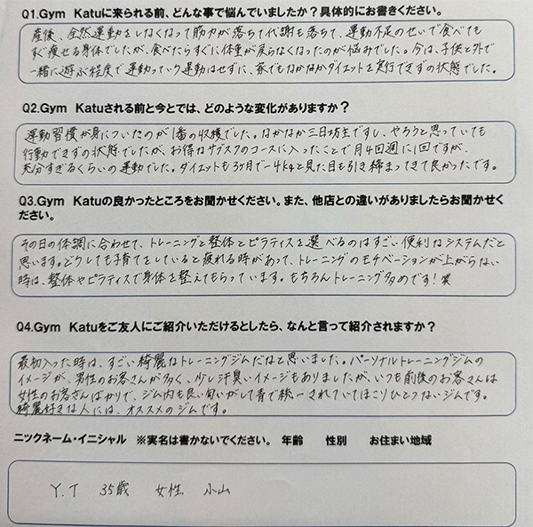 3カ月で-4kg!運動習慣がついて見た目も引き締まりました! Y.T様 35歳 女性 小山市